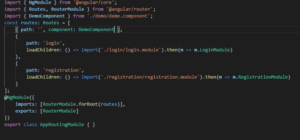 So here main property which is used to load the lazyload mdoules is loadChildren(). This way the lazy module will only be loaded when the lazy route is triggered by the user.