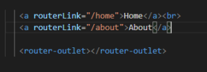 Now lets create two link inside the app.component.html file i.e home and about. For Example –